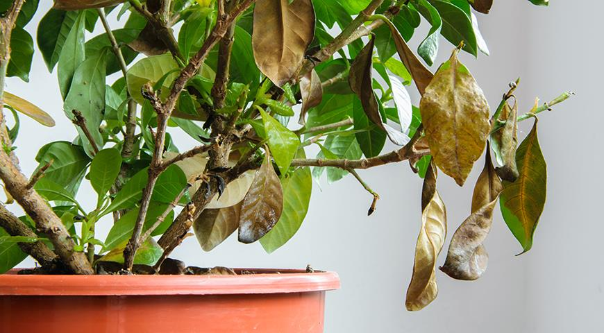 - Перелив: Избыточный полив, особенно в холодное время года, когда рост замедлен, может привести к корневой гнили, что проявляется в увядании и сбросе листьев.