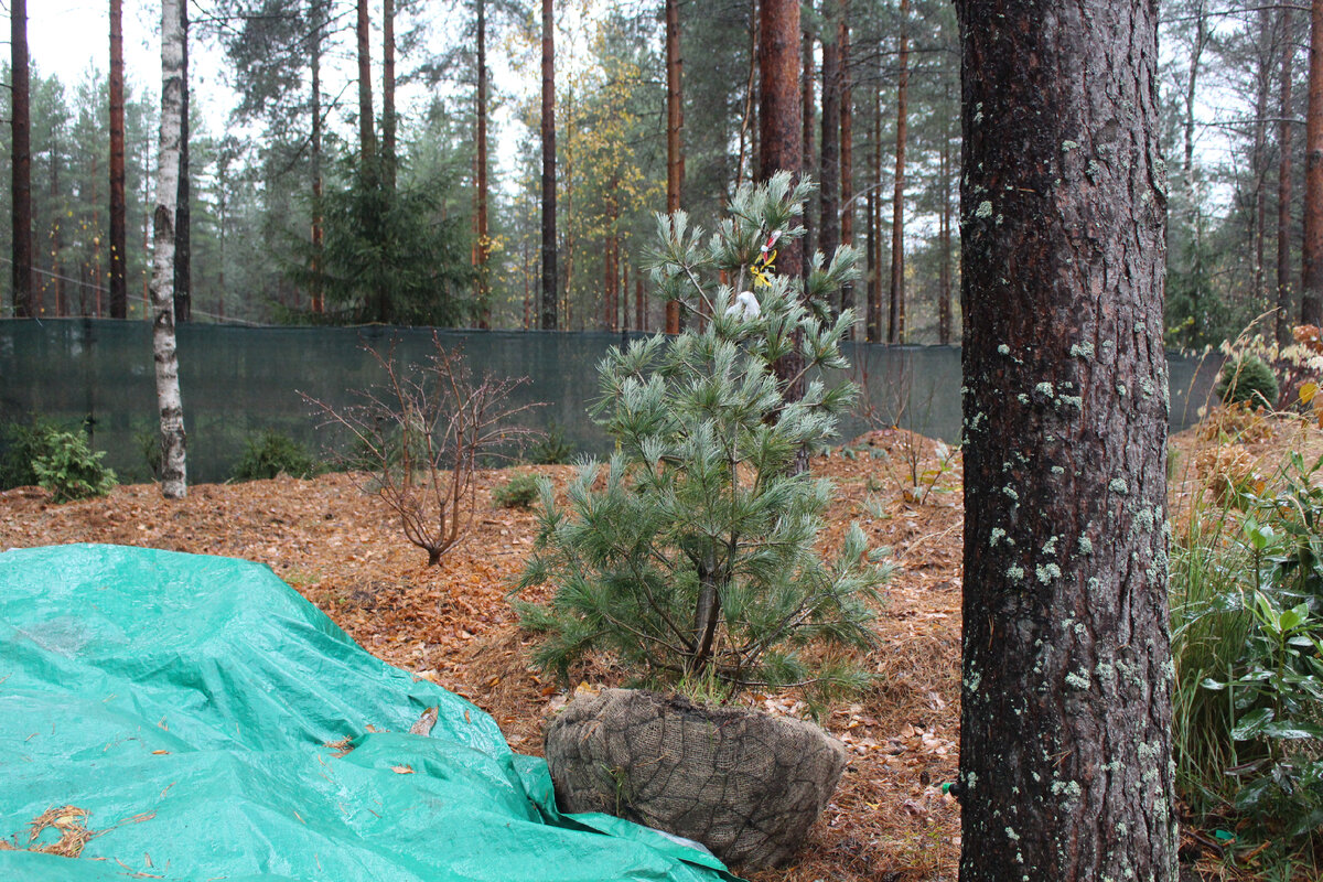 Среди деревьев нашлась и сосна с поразительными шишками на вершине. Когда сотрудники питомника выкопали растение, они проявили заботу: ком земли обернули в мешковину и укрепили на сетке. Этот шаг очень важен для обеспечения здоровья корней и сохранности растения.