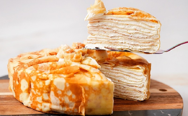 Просто: тонкие слои блинов равномерно пропитываются кремом и дают ощущение «тающего» десерта. Холодный крем удерживает форму, а мягкие блины дают нежную текстуру.