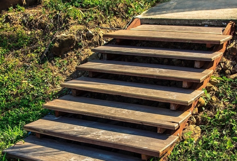 Для создания лестницы на пологом склоне идеально подходят простые деревянные конструкции. Доски, обработанные специальными защитными составами, прослужат долго и надежно. На начальном этапе рекомендуется сделать ступенчатые выемки в грунте, чтобы обозначить места установки ступеней. Используя деревянные колышки, можно обеспечить корректное направление и уровень.