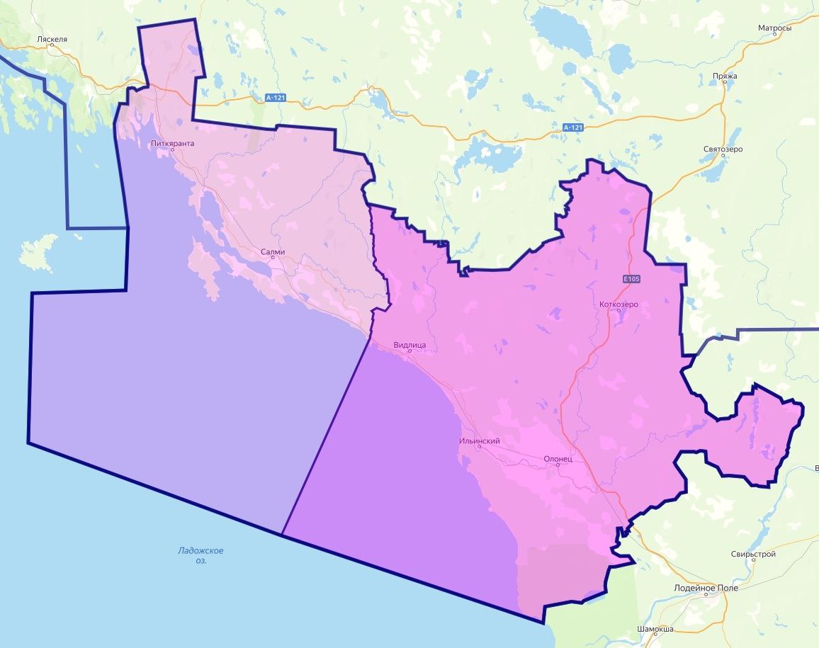 В состав округа входят территория муниципального образования "Олонецкий национальный муниципальный район" и часть территории Питкярантского муниципального округа: