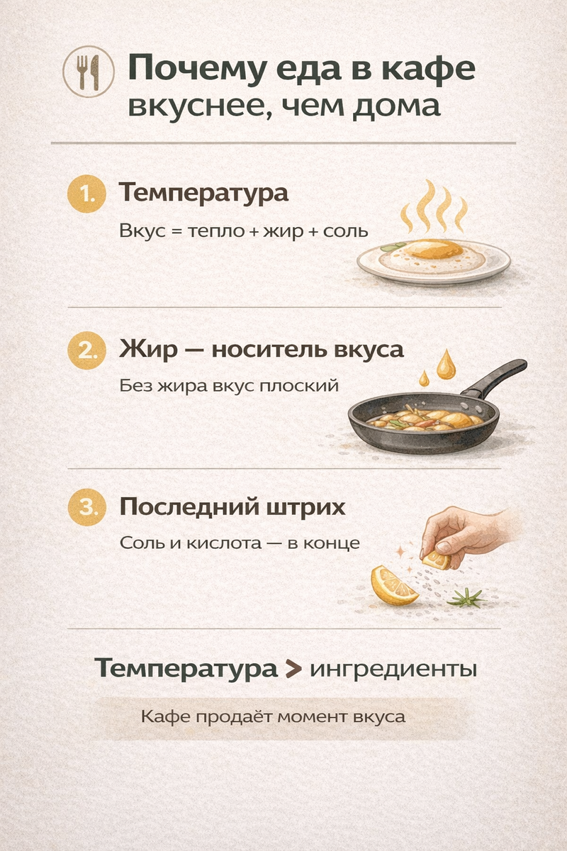 Не потому что повар — гений. Не потому что дома «руки не те». Просто вспоминайте о том, что вкус — это физика. Если вы научитесь управлять температурой, жиром и последними штрихами, еда дома перестанет проигрывать кафе и станет настоящим кулинарным наслаждением, пишет источник.