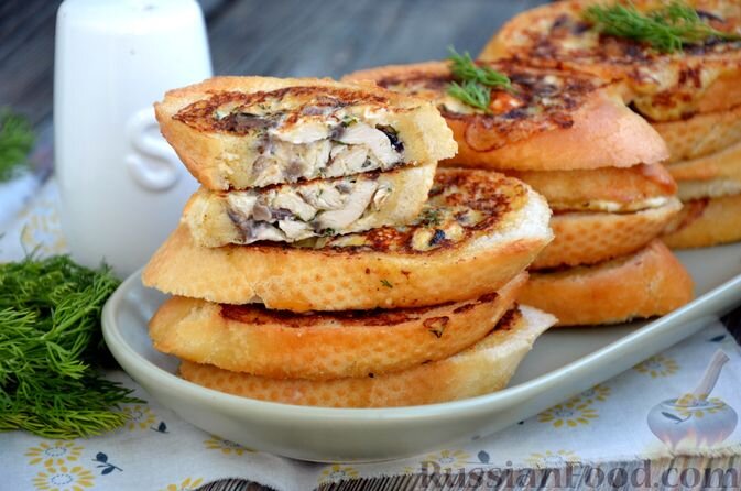 Горячие бутерброды из багета, наполненные куриным филе и сочными шампиньонами, станут отличным перекусом. Просто готовьте их на сковороде, и горячая закуска будет всегда под рукой!