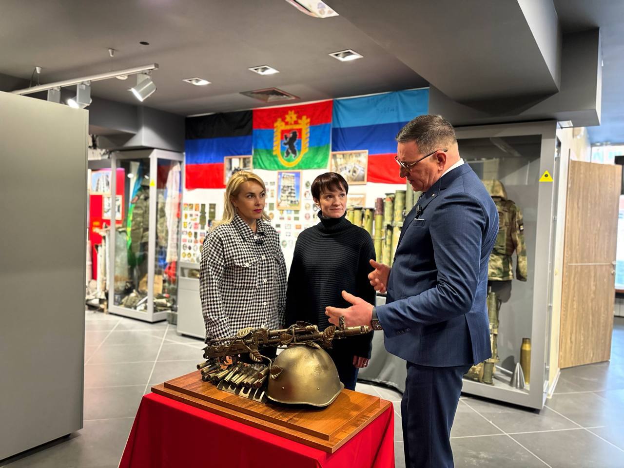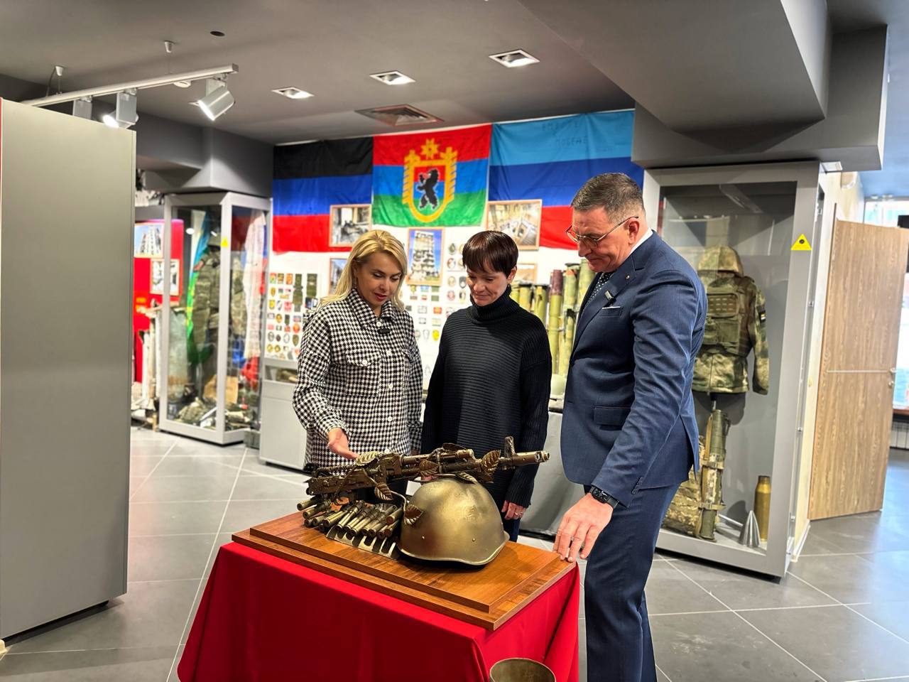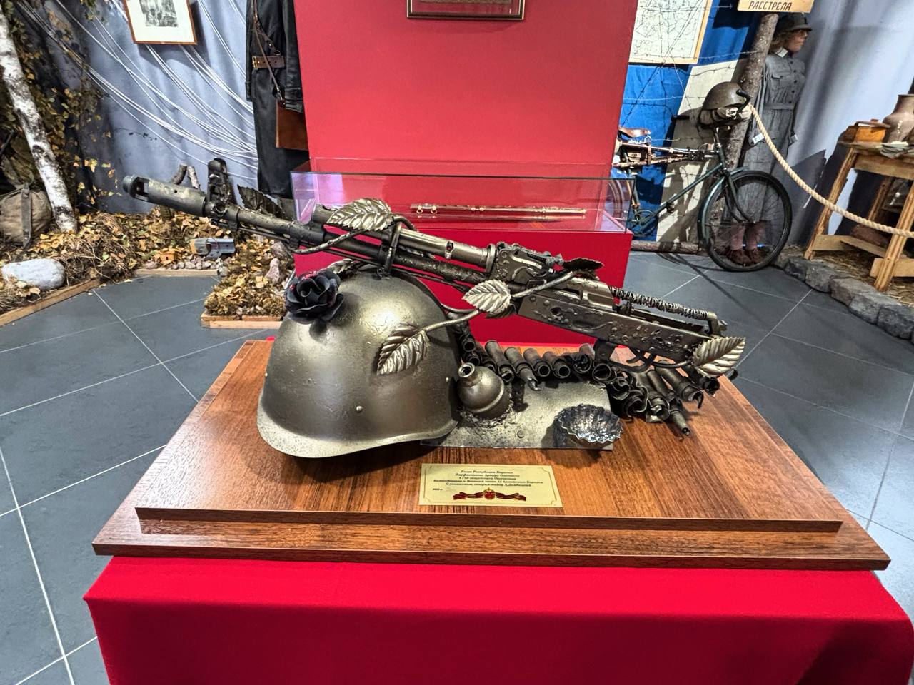 Благодарю Главу Карелии Артура Парфенчикова за переданный центру экспонат — уникальный образец армейского творчества. В этой композиции соединились символы защиты и жизни: стальной шлем, ручная граната, автомат Калашникова, который обвивает стебель розы, гильзы и пулеметная лента. Также в коллекцию передана гильза от танкового снаряда.