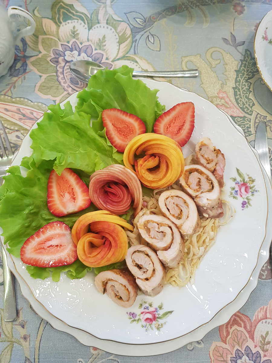 Подготовленные рулеты обмакиваются в яйца и укладываются на противень с пергаментной бумагой. Затем запекаются в духовке при максимальном гриле 250°C в течение 25 минут. На завершение остуженные яйца обжариваются и нарезаются мелкими полосками. Подача: на тарелку выкладываются листья салата, нарезки из нектаринов и персиков, добавляется клубника и полоски яйца. Достаем рулеты из духовки, удаляем зубочистки и нарезаем их наискосок. Это блюдо будет великолепно как горячим, так и в качестве холодной закуски. Приятного аппетита!