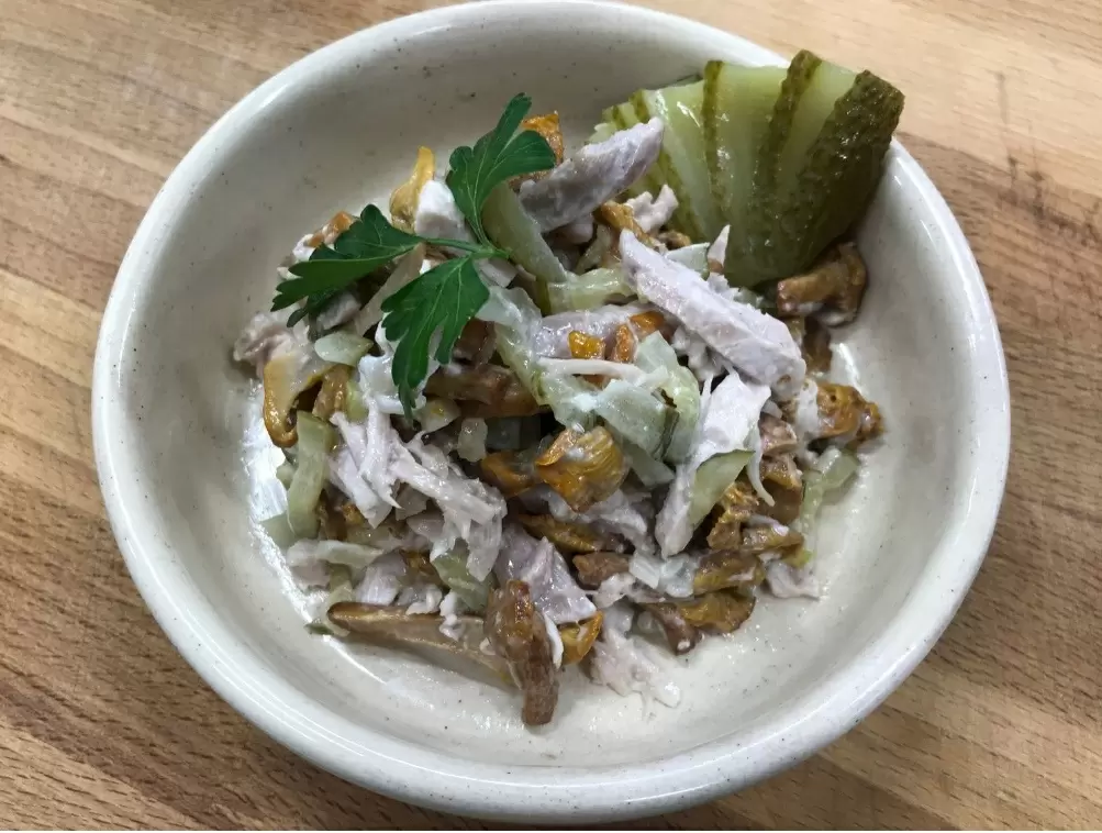 Основу составляет ветчина, грибы и огурцы, соединённые луковой ноткой. Разного рода заправки — майонез или сметана — придают кремовую текстуру, а зелень завершает образ, добавляя свежесть.