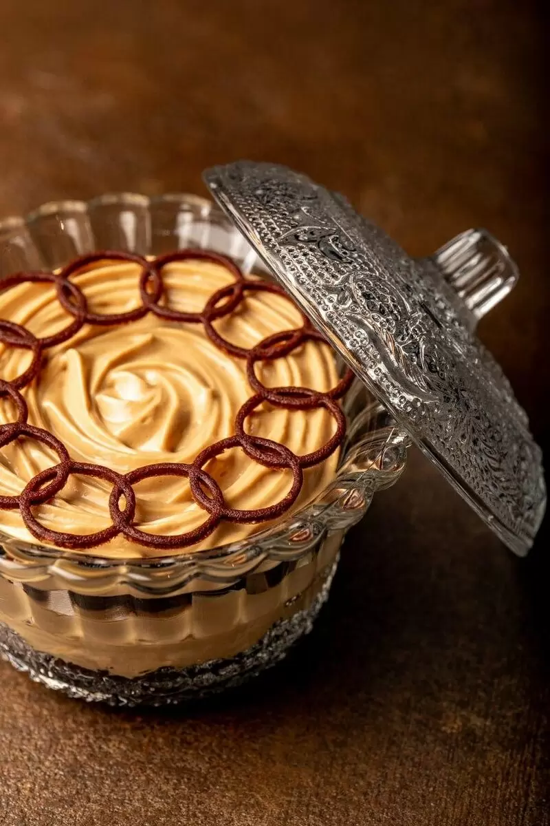 На дно чаши выкладывается первый бисквит, пропитывается 10 г кофе и покрывается 30 г крема. Второй корж также пропитывается, затем укладывается джем и снова крем, посыпается кедровыми орехами. Завершает сборку третий корж, который необходимо также пропитать и покрыть оставшимся кремом.