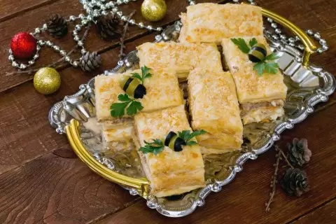 Вечернее настроение на столе создаёт не яркая драматическая подача, а спокойная мысль о простоте и эффектности. Когда на тарелке слои закусочного Наполеона уже выстроены в аккуратную геометрию, становится понятно: привычные ингредиенты могут выглядеть особенными без лишних усилий.