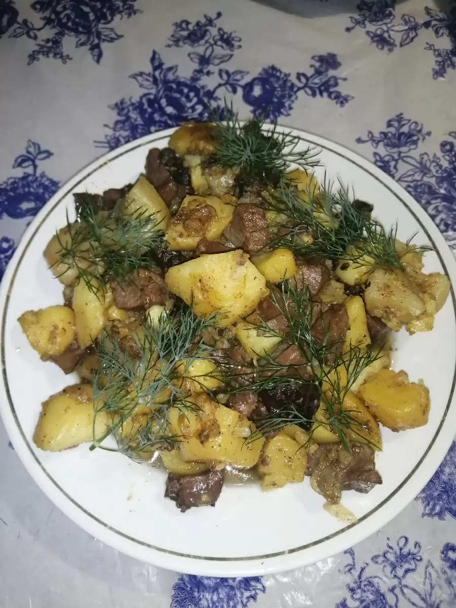 Пришло время печёнки. Она быстро готовится, поэтому её обжаривают 3-5 минут, постоянно контролируя огонь. В казан затем выкладывают картошку, слегка обжаривают, добавляют бульон и оставляют на 15-20 минут. В процессе приготовления важно периодически перемешивать, чтобы картошка не подгорела.