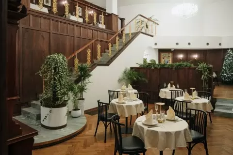Организаторы ресторана представили интересный концепт: заведение включает четыре тематических зала, каждый из которых отражает свою эпоху. Гости могут перемещаться от средневековой таверны до советской эры, где на стенах висят агитационные плакаты, а в меню можно найти традиционные граненые стаканы и популярное в свое время «Папараць-кветку».