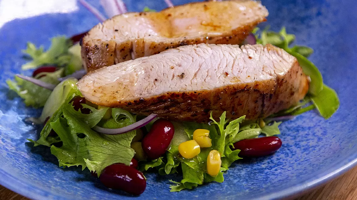 Салат выкладывают на тарелку, сверху помещают нарезанную индейку и листья салата. Это блюдо станет не только украшением стола, но и настоящим кулинарным наслаждением.