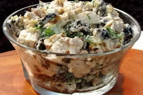 Для добавления сладости и оригинального вкуса в салат, в него добавляют чернослив и грецкие орехи. При необходимости чернослив можно размочить в кипятке на 10 минут, чтобы он стал мягче, после этого его мелко нарезают. Орехи следует крупно порубить и добавить к остальным компонентам, а свежую зелень нарезают и отправляют в миску с салатом.