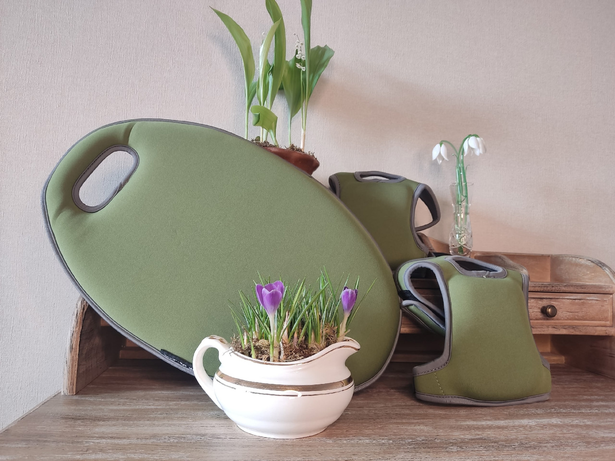 Для тех, кто активно трудится в саду, идеальным решением станут наколенники. Они изготовлены из таких же материалов, как и коврики, и обеспечивают крепкую фиксацию и поддержку колен. Эти наколенники позволяют легко передвигаться по участку, сохраняя при этом комфорт.