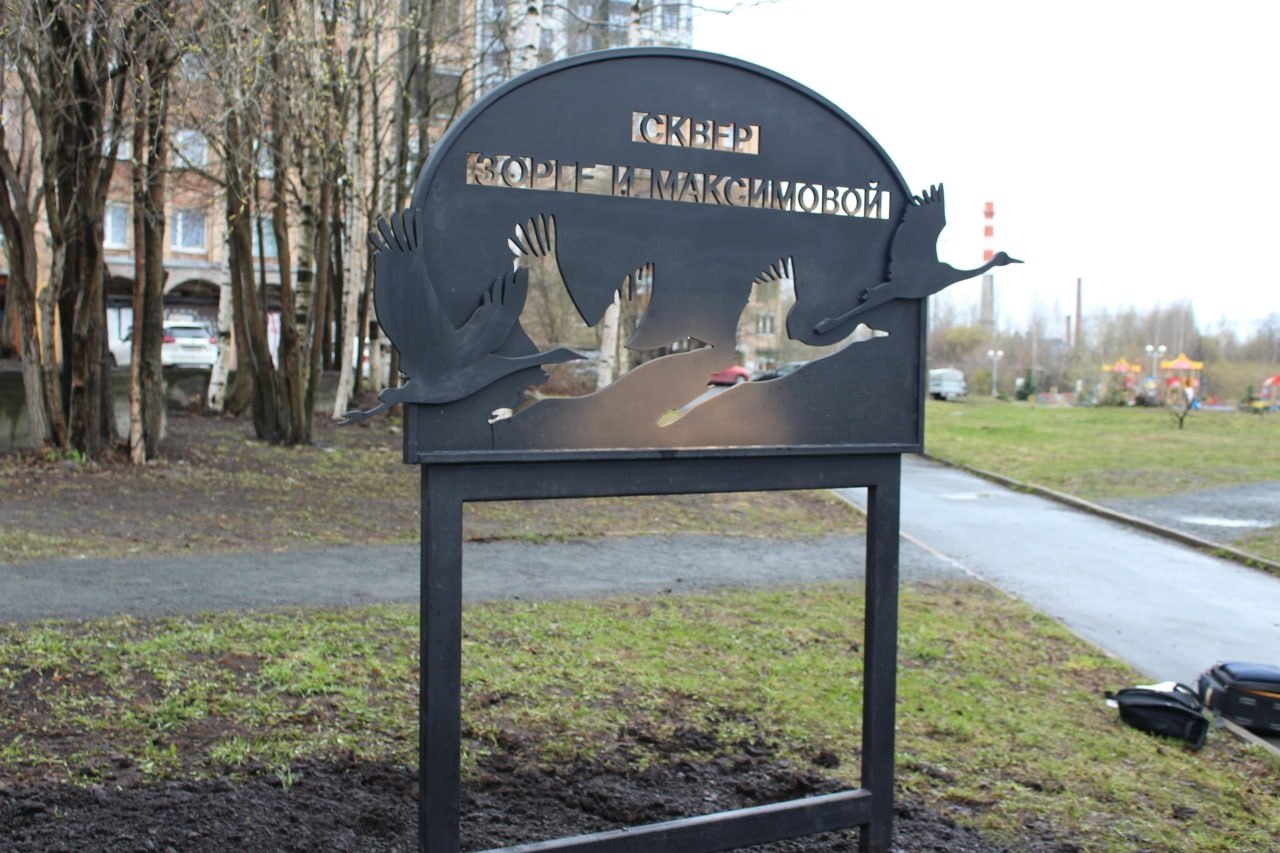 Памятный знак установили в сквере Зорге и Максимовой. На знаке изображены два летящих журавля, спроектированные художником и дизайнером Владимиром Ваяном.