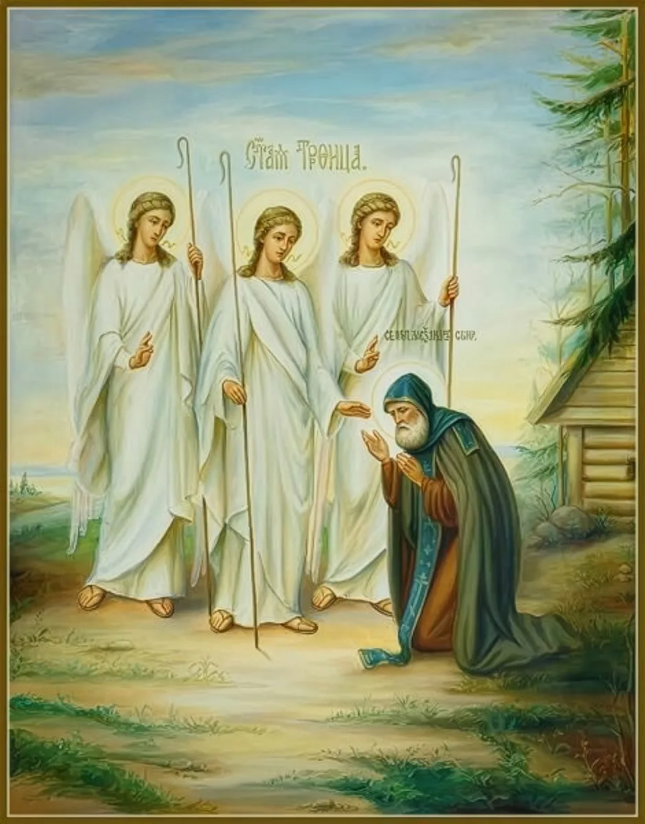 Тогда он понял, Кто перед ним. Господь велел построить обитель. «Какое имя будет у церкви?» — спросил преподобный. И услышал: «Подобно тому, как видишь ты Меня в Трёх Лицах, так и церковь поставь во имя Отца и Сына и Святого Духа».
